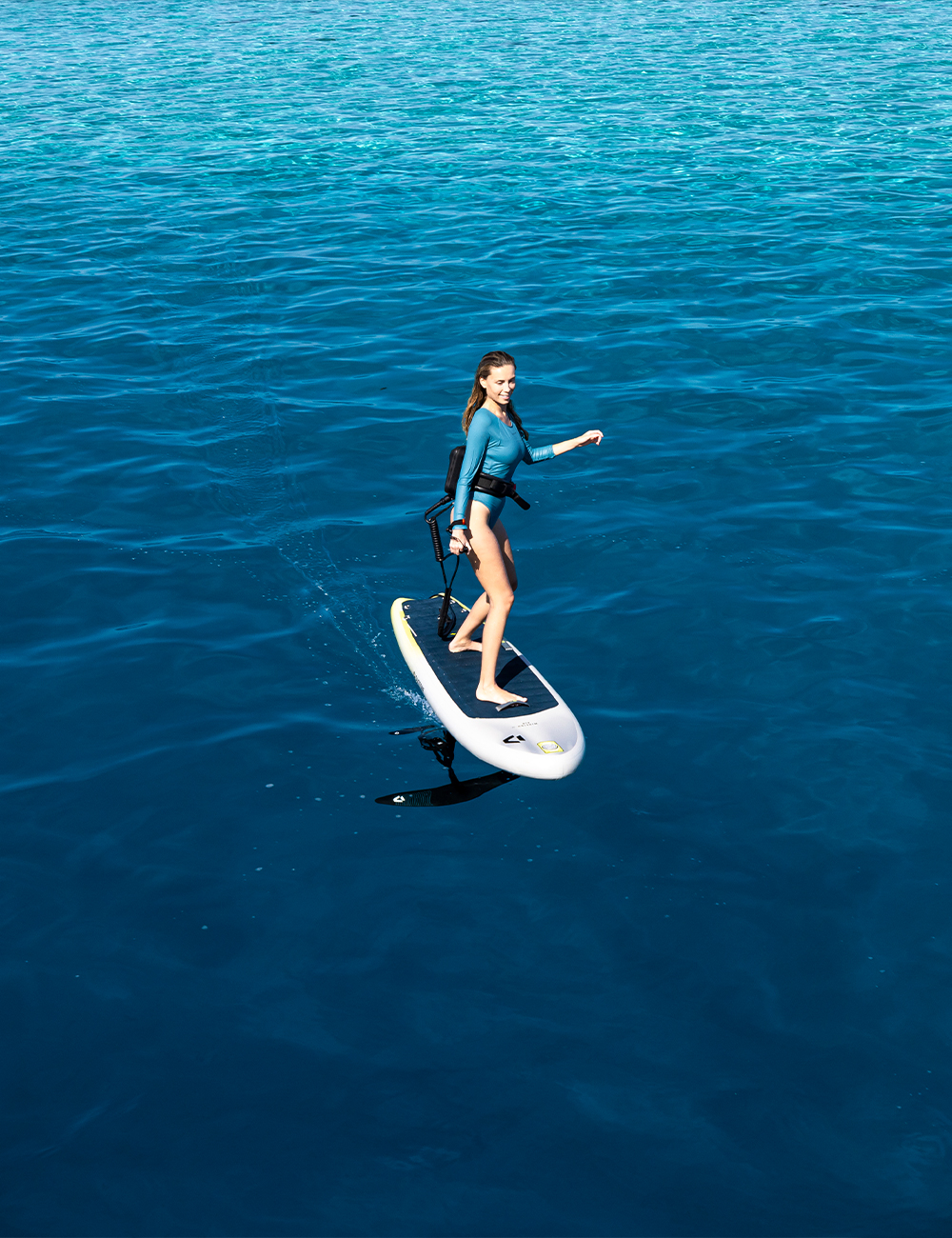 The motor pod is fully integrated into the mast and positioned behind the leading edge (17cm below top plate), minimising drag even during touchdowns, featuring the two-blade folding propeller that further eliminates drag for effortless glide on waves.