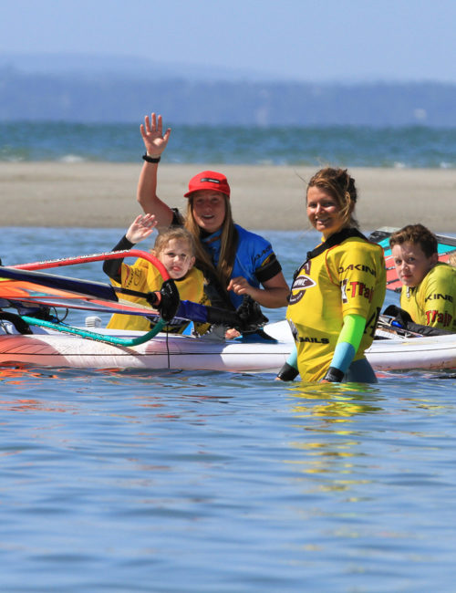 Most of the tuition is done directly on the water. We get them up and going straight away – you will be surprised by the speed of the results! All of the learning is made easier through the use of modern wide style beginner boards and very light, soft children’s sails. All of the boards are driven down the beach. The kids carry the small sails to the water with the help of the instructors.