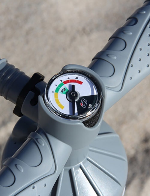 The high quality v2 kite pump features double-action inflation, an extended barrel, ergonomic handgrips & foot base, foam air filter and a calibrated pressure gauge; however the biggest innovations hide inside.